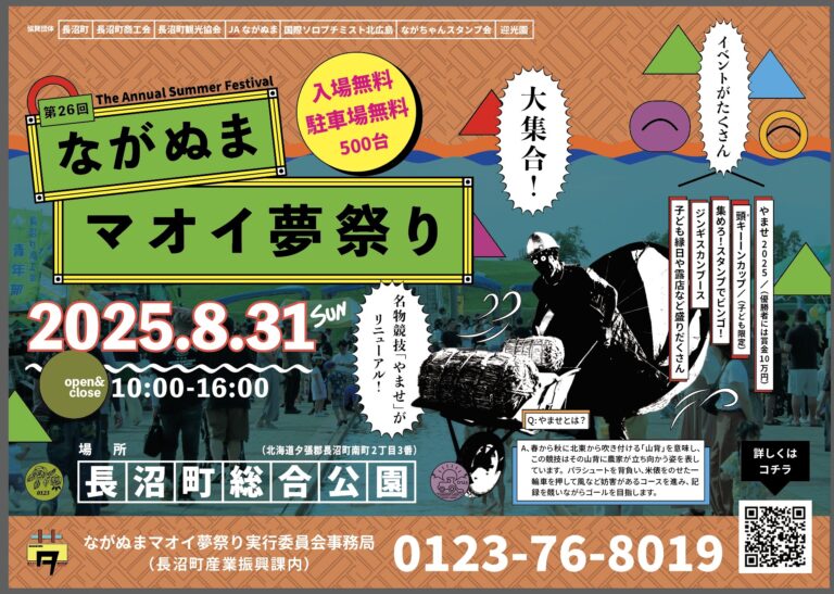 〇協賛団体 長沼町、長沼町商工会、長沼町観光協会、国際ソロプチミスト北広島JAながぬま、ながちゃんスタンプ会、迎光園