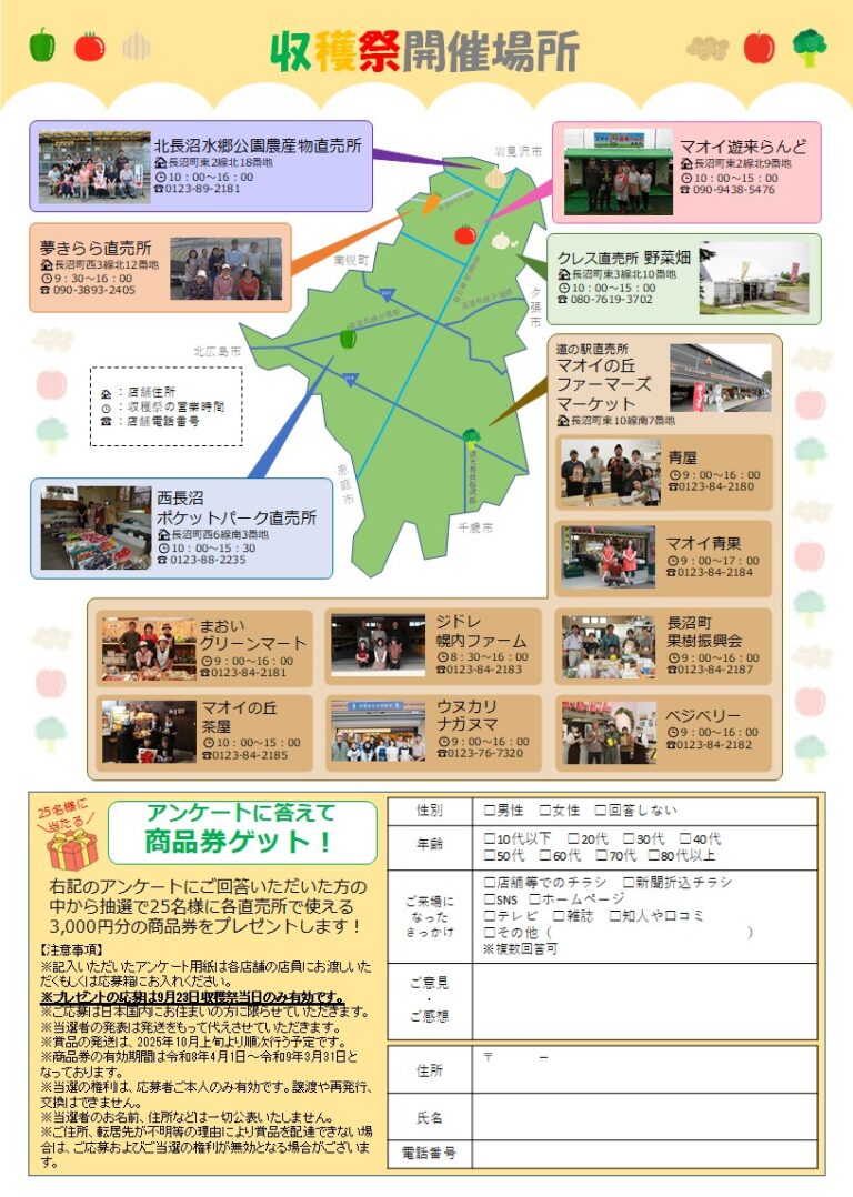 また、当日アンケートにお答えいただいた方の中から抽選で25名様に各直売所共通で利用できる商品券3,000円分をプレゼント!ぜひお越しください!