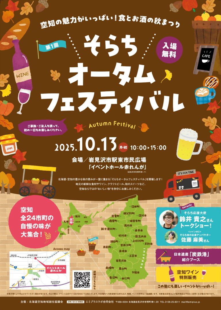 空知管内24市町のご当地グルメやお酒、物産が一堂に会し、空知の食やお酒の魅力を伝えるイベントです。会場では、24市町の食・お酒ブースに加え、空知ワインと食のコラボレーションを提案するマリアージュブース、日本遺産炭鉄港PRブースなどが展開されます。また、ステージイベントには、そらち応援大使の鈴井貴之さんとそらち食の応援アンバサダーの佐藤麻美さんが登場し、トークセッションが行われる予定です。
